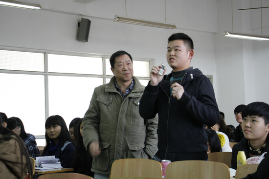 图为科技日报记者刘曙甲为同学们讲如何做好科技新闻报道 摄影:田谊