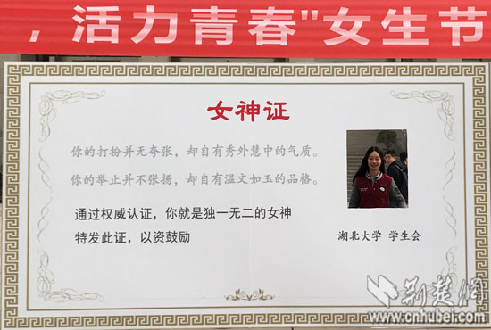 “通过权威认证,你就是独一无二的女神”,3月7日当天,湖北大学学生会特意制作了一份可以拍照的“女神证”。淡黄色的底色配古典花纹,上面还印着“温文如玉”这样的修饰词。同时,“女神”们只要参与“在湖大寻找最美的你”微博话题,3月8日即开奖送一支YSL口红。