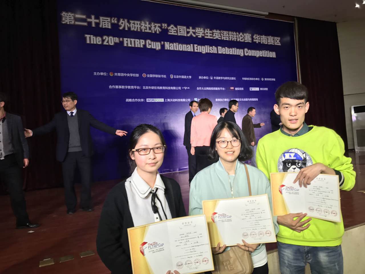 此次华南赛区总决赛由一轮热身赛、五轮循环赛组成,辩题涵盖政治、经济、文化、社会等各项知识领域。在比赛过程中,该校英语辩论队与中山大学、汕头大学、华中科技大学等优秀代表队同台竞技。面对强劲的对手,他们凭借优秀的综合实力,沉着应对,发挥出色,最终荣获三等奖。“前期我们做了非常充分的准备,有时连睡觉的时候都在记单词,能够与那么多优秀的对手以比赛的方式切磋学习让我受益匪浅。”汪晨兴奋的说。