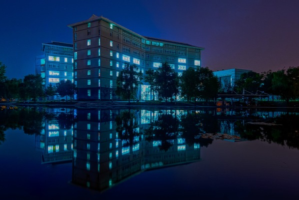 图为夜幕下的图书馆 摄影:叶鑫坤