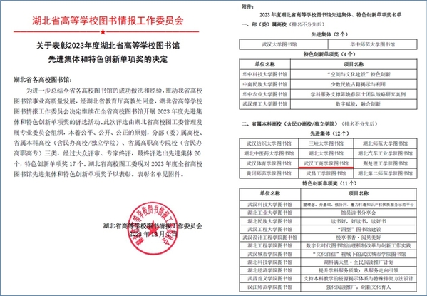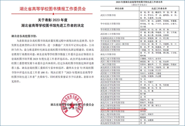 图为学校图书馆荣获“2023年度湖北省高等学校图书馆先进集体”称号