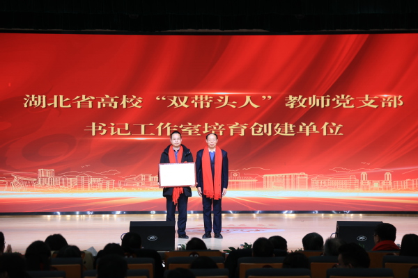 图为李祖超副校长为湖北省高校“双带头人”教师党支部书记工作室培育创建单位的代表颁奖 摄影:芮雨欣