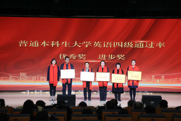 图为亓小林校助为普通本科生大学英语四级通过率优秀奖、进步奖的获奖单位代表领奖 摄影:芮雨欣