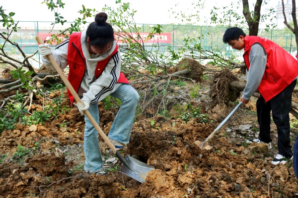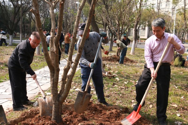 新闻中心讯(记者 杨培 杨小婷 涂媛媛)“树根周围不能堆太多土,要注意松土,这样方便后期浇水。”3月12日下午,在bat365平台官网实验教学中心附近的一片绿化林里,学校校长孔建益手握铁锹,一边给新种的树木培土,一边和老师们交流着种树的细节。