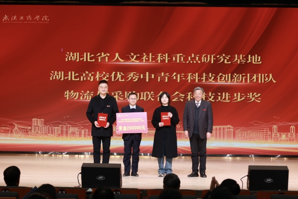 图为桂裕清副校长为湖北省人文社科重点研究基地、湖北高校优秀中青年科技创新团队、物流与采购联合会科技进步奖代表颁奖 摄影:芮雨欣