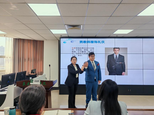 邵晓晖教授从“师者形象是行走的教育名片”理念切入,系统解析了教师职业着装规范、仪容仪表标准及职场礼仪等核心内容。通过现场示范和情景模拟,她展示了优雅而不失活力的教师形象塑造技巧,并指导了站姿、手势、表情管理等实用技巧。