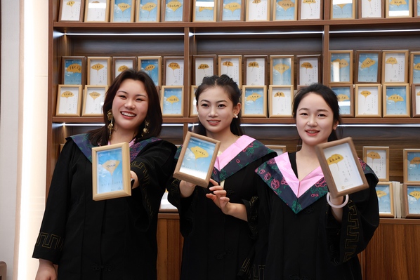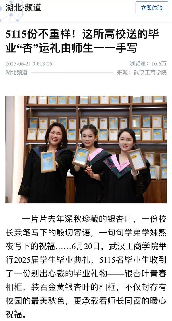 毕业典礼当天,该校校长孔建益、副校长刘生元将这份特别的礼物送到优秀毕业生代表手中,各二级学院也在各自的学位授予仪式上送出这份礼物。不少毕业生表示,每一片叶子都承载着独特的祝福,收到相框的瞬间就像拆盲盒一样充满期待,而收获的感动更是远超预期。