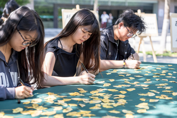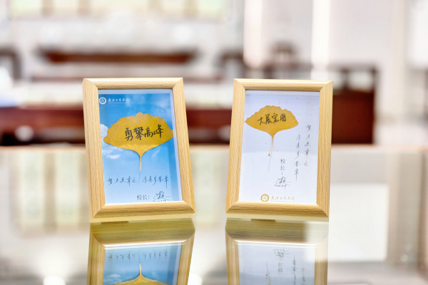 今年毕业季,这些承载着时光印记的叶子被取出,由学弟学妹、毕业班辅导员和学院党总支书记在每一片银杏叶上写下毕业祝福,并张贴定格在相框背卡上。相框背卡上印有校长孔建益教授题写的“努力更幸运 未来多喜幸”寄语和签名。这份毕业礼物的相框和背卡有两种颜色,每一片银杏叶的形状、大小、颜色都不相同,手写祝福的内容和字体风格也各异,使得每一份毕业礼物都成为独一无二的青春纪念品。