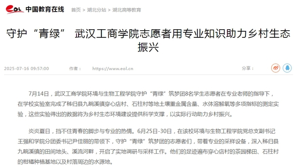 未来,团队将持续跟踪秭归生态治理与产业发展,深化校地合作,助力乡村振兴。带队老师尹佳丽表示:“守护青绿,步履不停。我们将努力让‘三下乡’的青春足迹,化作连接高校智慧与基层需求的坚实桥梁,在荆楚大地上绘就更绚丽的生态振兴画卷。”(通讯员:陈雯茜 蓝静)