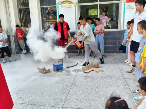 在消防课堂上,志愿者首先给大家讲了常见的消防隐患,火灾的起因以及如何预防火灾,当火灾发生时我们该如何应对。志愿者们还现场演示了灭火器 “一提二拔三握四压” 的使用步骤,实践环节中,孩子们在志愿者的一对一指导下轮流体验使用灭火器去扑灭燃烧的火焰