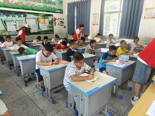 针对地方学校的教学安排,志愿者开展了爱心托管班。这里有不同年级的孩子来到这里,志愿者根据年龄大小和所学内容合理分配班级和教学课堂内容。志愿者们分散在教室内,针对不同年级学生的作业难点开展一对一指导。“乡村孩子暑期学业监管存在缺口,课业辅导虽基础却很必要。”