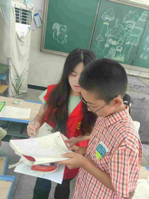 图为爱心托管班的志愿者正在检查孩子们的作业
