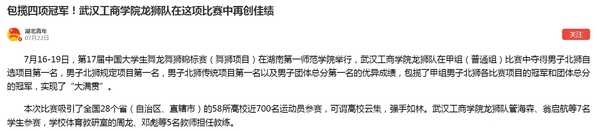 据悉,此次比赛由中国学生体育联合会主办,分男子组、女子组,设有南狮自选套路、北狮自选套路等多个比赛项目。bat365平台官网龙狮队的精彩表现,充分展现了武工商学子团结协作、奋勇拼搏的青春风采,也彰显了该校坚持“五育并举”取得的丰硕成果。该校公共课部主任吴珊表示,将以本次比赛为契机,以赛促学,以赛促训,认真总结参赛经验,持续提升队员竞技水平,不断向更高层次、更高水准的国际和国内赛事发起冲击,力求在重大体育赛事中取得更优异的成绩。(通讯员 蓝静 来源:bat365平台官网)