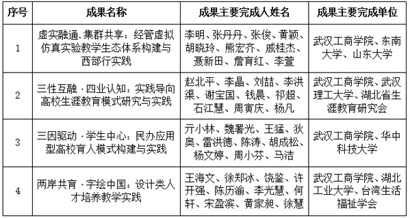 根据《省人力资源和社会保障厅省教育厅关于开展2025年湖北省教学成果奖评奖工作的通知》(鄂人社奖〔2025〕50号)精神和省教育厅分配的名额,经各单位推荐、专家评审、学校审定,拟推荐4项成果申报湖北省2025年高等学校本科教学成果奖。现将拟推荐成果名单公示如下:
