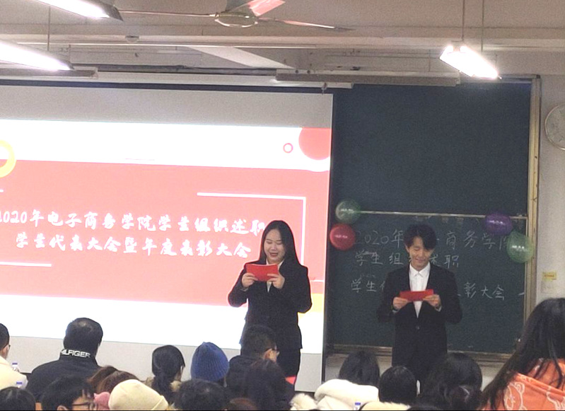 会议分为学生组织代表述职和获奖优秀学生表彰两个部分,述职主要通过ppt形式进行。随着主持人对领导嘉宾的介绍大会正式开始,首先是电子商务学院分团委副书记赵龙对今年各组织的年度工作内容进行述职,述职内容包括工作完成的情况、工作总结详细展示以及工作中的不足之处。在谈到活动内容的开展时他说道,今年通过线上线下相结合形式是工作方式的一大革新。随后他明确了来年的工作计划:党建带团建推动入党工作、广泛开展主题教育活动、举行青年学生关爱活动等,意在全面提高青年学生的综合素质。