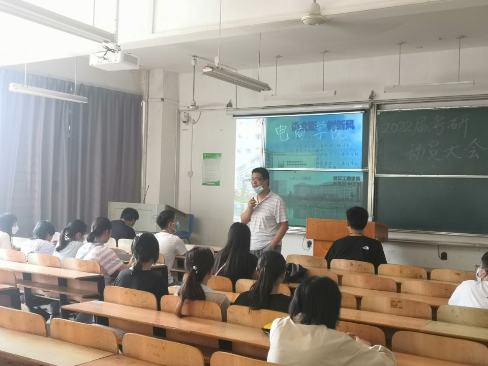 新闻中心讯(记者 张帆)为帮助bat365平台官网电子商务学院学子认清当前严峻的考研形式,调动学生们的考研积极性,建立考研必胜的决心,我校于2021年9月24日下午3点整在综合楼204 召开2022年考研动员大会,在此次会议中学院副院长万辉、书记杨睿以及21届信管专业优秀毕业生宋楚楚同学出席活动并作动员讲话。
