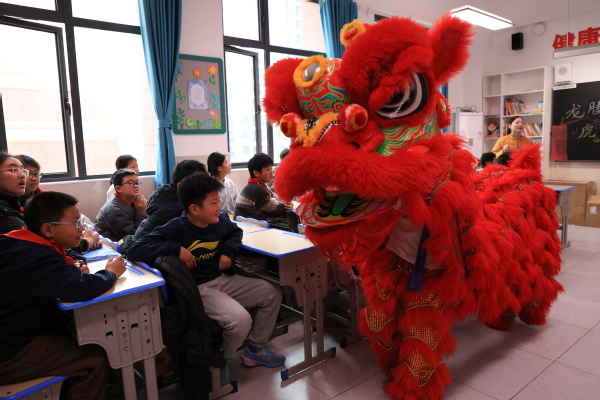 随后的舞狮表演将气氛推向高潮。由4名大学生扮演的两只“狮子”活灵活现,穿梭于课桌之间,孩子们笑声不断,纷纷上前与“狮子”亲密互动,现场气氛热烈。