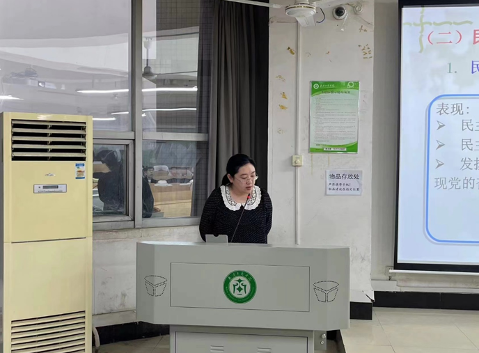其次,薛老师着重讲解了“党的组织制度内容”,深化了入党积极分子对党组织制度的印象。薛老师通过介绍民主集中制的含义、形成与发展、代表人物等内容,强调了民主集中制既是党的根本组织原则,也是群众路线在党的生活中的运用。紧接着,薛佳老师借由展示大量历史以及国内外的图片资料,阐明了民主与集中是辩证统一、相互制约的关系。而民主集中制作为党的根本组织原则,是党的组织制度的核心内容,因此运用和借鉴这一核心组织原则,巧妙而有力地处理党内关系、选举制度、党的各级领导机关地位及其各层次之间关系、党的上下级组织之间关系、党的领导人同党和人民之间的关系等诸多重要问题。