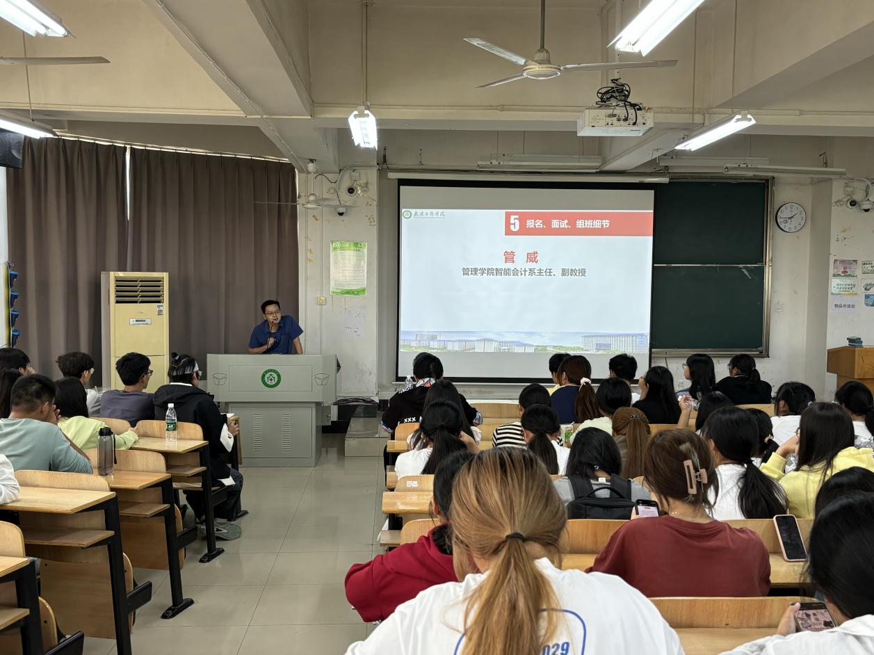 最后,智能会计系主任管威副教授介绍班级报名、面试及组班细节,并阐述学校为深化产教融合,搭建专业平台,着力于以优质师资力量,定制化人才培养方案,双导师制教学等培养模式组建产教融合CPA精英班,旨在促进科研成果转化和企业技术创新,提升学生的实践能力和就业竞争力。
