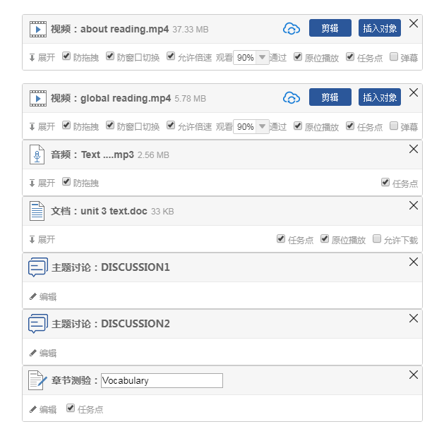无法跟学生面对面交流,只有在章节设计上“做文章”。录制好讲解小视频之后,就需要进入到课堂设计环节了。录播课如何实现课堂互动?如何检测学生的学习效果呢?通常情况下,我会将需要学生思考的问题放在平台的讨论区域。学生的英语水平参差不齐,对于一些老师还没有讲到的问题,或许一开始也不能给予完全正确的回答。讨论区和章节测试不同在于:不论回答的对与错,只要学生参与讨论了,就会有相应的得分。这样可以鼓励同学们参与讨论的积极性。学生观看视频之后,我会利用章节测试,检测学生有没有认真观看视频,是不是真正理解了需要掌握的知识点。于此同时,我还要求同学们拍照上传他们的课堂笔记,以帮助他们认真听讲。