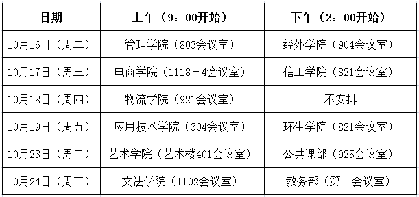 学校定于2018年10月16日 -10月24日进行院系调研工作,调研参会人员主要是各学院院长、常务副院长、教学副院长、系主任和教学秘书,调研内容为如何改善教学管理工作的问题并提出解决措施(见附件)。本次调研工作由陈校长和夏校长带队,教务部相关人员一起参与调研。