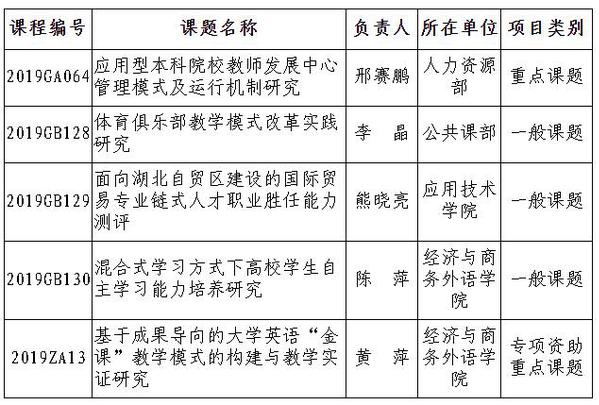 2019年湖北省教育科学规划课题实行限额申报,bat365平台官网共申报11项,获批5项,此次获批课题数量仍居同类高校前列,立项率达45.45%,高出全省平均立项率16个百分点。