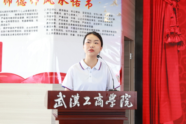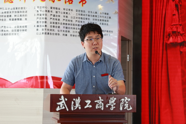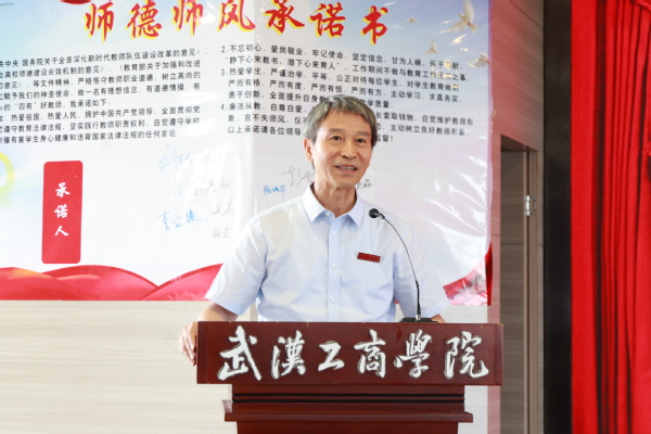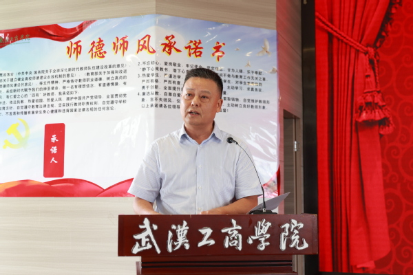 刘生元书记为新进教职工代表佩戴校徽,衷心祝贺新进教职工们成为武工商的一份子,并带领大家举行了新进教职工入职宣誓仪式,签署了《教师师德承诺书》。