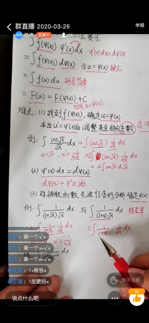 3.特别值得一提的是该教师没有电脑疫情期间又无法购买,采取用A4纸手写摄像的方法直播,由于准备充分教学效果一点也不逊色,讲课互动就像在教室讲解一样游刃有余;