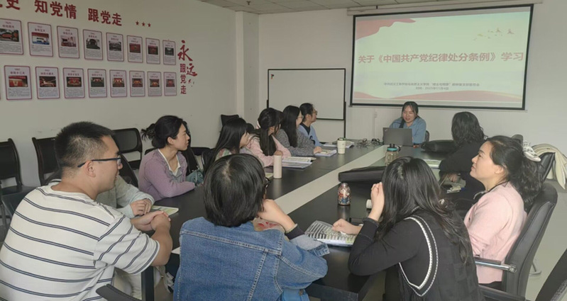 (通讯员张唯)为深入学习和贯彻落实习近平总书记关于党的纪律建设的重要论述,全面加强党的纪律建设,督促党员干部强化自我约束,严守党的纪律,规范工作生活行为,2025年11月4日,中共bat365平台官网马克思主义学院“德法与纲要”教研室支部委员会在1102会议室召开《中国共产党纪律处分条例》专题学习。本次活动由党支部书记董荟楠主持,党支部全部成员参会学习。