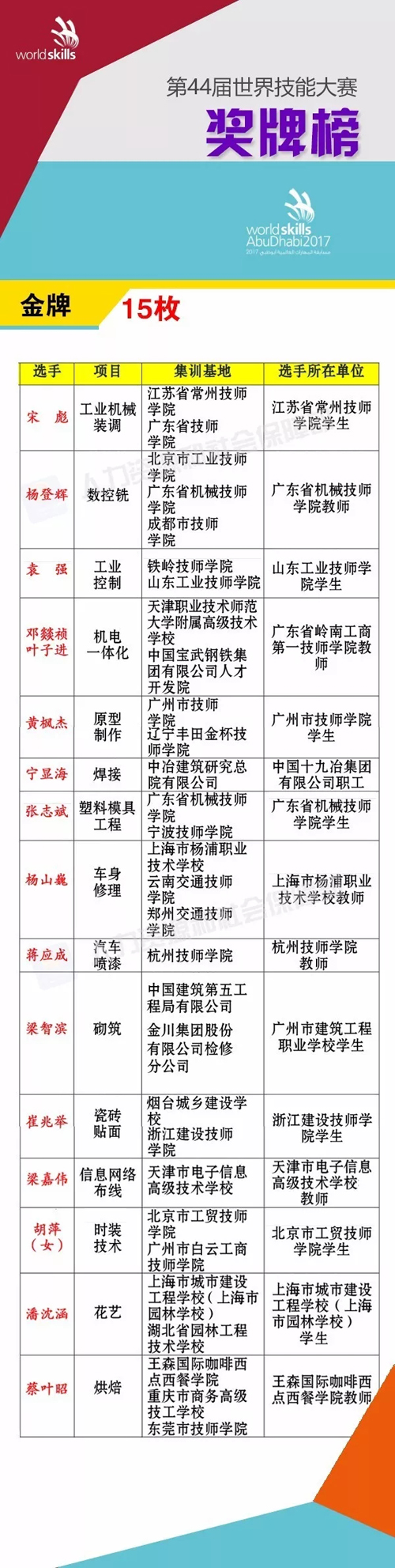 当地时间10月19日,第44届世界技能大赛在阿联酋阿布扎比落下帷幕,我国52名选手在47个项目的比赛中取得了15枚金牌、7枚银牌、8枚铜牌和12个优胜奖的优异成绩,创造了我国参赛以来的最好成绩。