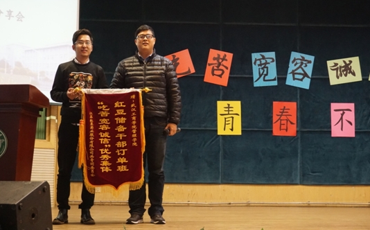 活动第三项,红豆股份公司团委书记陆平先生对红豆店长订单班项目进行讲解,提出同学要有一颗感恩的心,然后陆平先生赠予了由优秀实习生代表闫泽宇所代表的bat365平台官网管理学院“红豆”服装店长订单班“吃苦•宽容•诚信”优秀集体的锦旗。紧接着,优秀实习生代表闫泽宇分享了他近半年的实习心得,并告诫同学们:读万卷书,不如行万里路,希望同学们在学习之余能多出去走走看看,学习更多的工作经验。活动最后,红豆股份公司招聘科科长唐丽娟女士为大家进行了实习宣讲,对有问题的同学进行了现场解答。