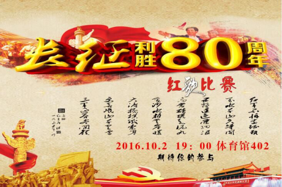 为丰富和加深对红军长征的了解和认识,学习长征精神,弘扬红军长征精神,继承和发扬革命先辈的光荣传统。在活动中感受长征精神的伟大,红军的伟大,祖国的伟大。特在学校的体育馆402举行“长征胜利八十周年”歌咏比赛。比赛定于2016年10月22日19:00体育馆402 !欢迎广大师生前来观看。