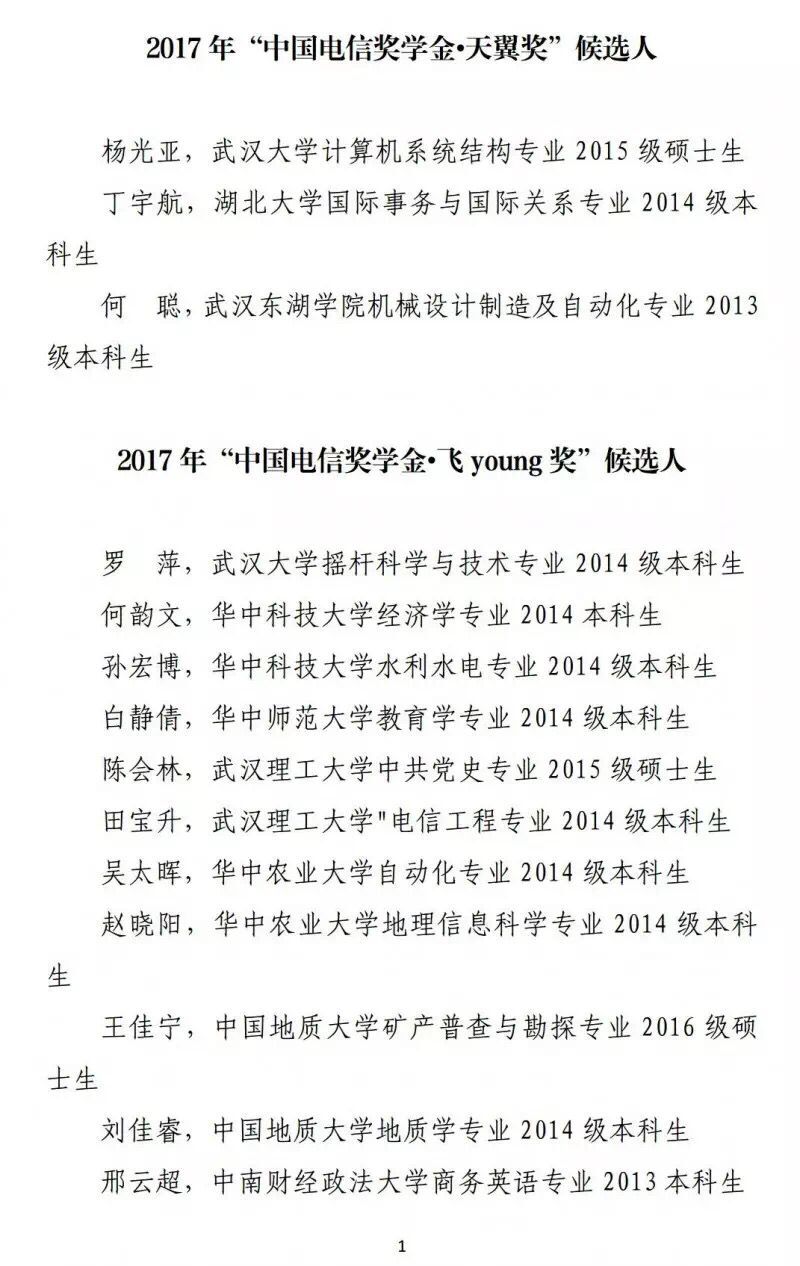 近日,经个人申请、校级团委审核推荐、团省委组织开展网上投票以及专家评审会综合评议,拟定了武汉大学杨光亚等3名同学作为我省推荐的2017年“中国电信奖学金•天翼奖”候选人,华中科技大学何韵文等74名同学作为我省推荐的2017年“中国电信奖学金•飞young奖”候选人。
