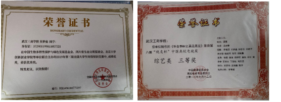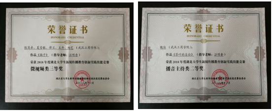 张滨淏同学在2019年全国大学生新媒体知识竞赛中获得国家级三等奖;和许潇等人编导的作品《自渡》在中国大学生微电影创作大赛中获得优秀奖;参赛作品《中国虾谷360品牌策划》在全球大学生品牌策划大赛中获得国家级二等奖。肖梦茹同学在2019年第三届全国大学生环保知识竞赛中获得优秀奖,制作的《毕业季MV之再见再见》荣获第八届“视友杯”中国高校电视奖综艺类三等奖。