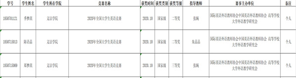 2020年,在全国大学生英语竞赛上,我院学生在指导老师带领下喜获佳绩,共获得国家级二等奖2个,国家级三等奖1个。