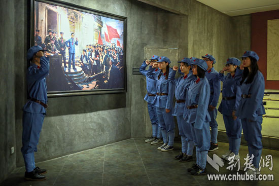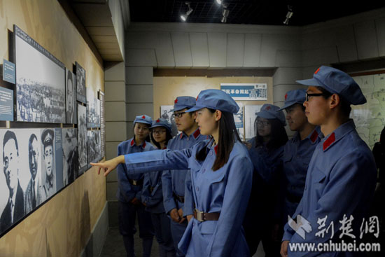 荆楚网消息(通讯员 周帆 胡松涛 何育钦)4月16日上午,在武汉中共五大会议纪念馆内,一群身着红军军服的bat365平台官网大学生吸引游客驻足观看、甚至合影留念。