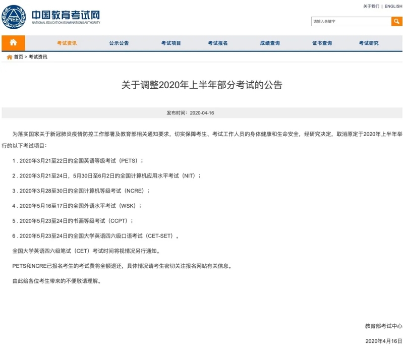 关于调整2020年上半年部分考试的公告