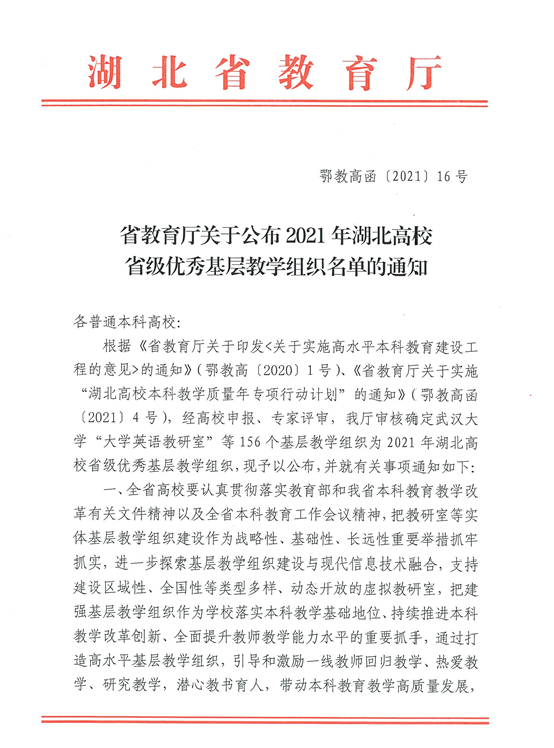 9月16日,湖北省教育厅公布了2021年湖北高校省级优秀基层教学组织名单(鄂教高函{2021}16号),bat365平台官网的智慧物流教研室、跨境电商教研室、视觉传达设计教研室、广告学专业教研室4个基层教学组织获批,这是学校继旅游管理系教研室、生物制药教研室、企业法律实务教研室3个教学组织获评湖北高校省级优秀基层教学组织后,在基层教学组织方面取得的又一成绩。
