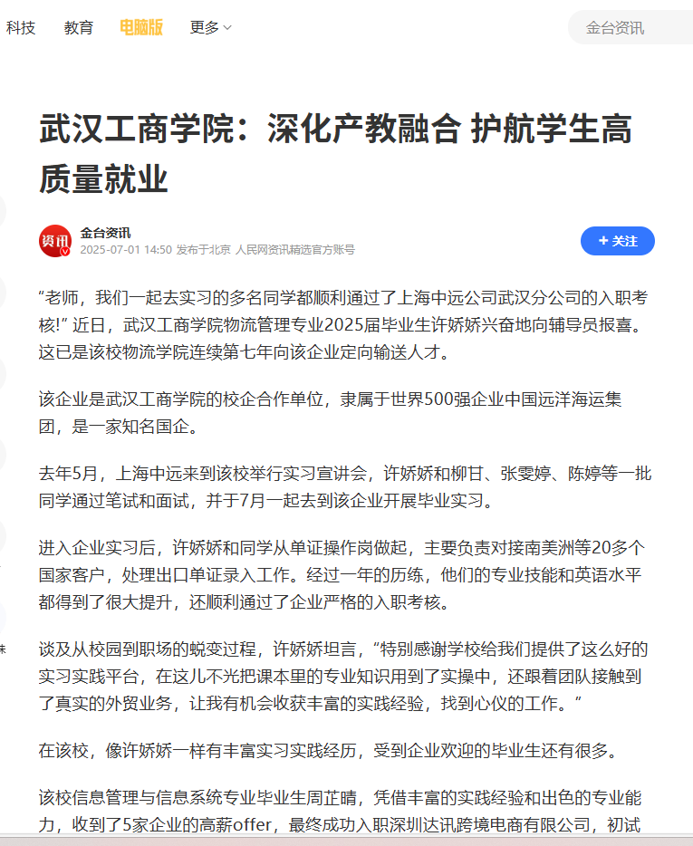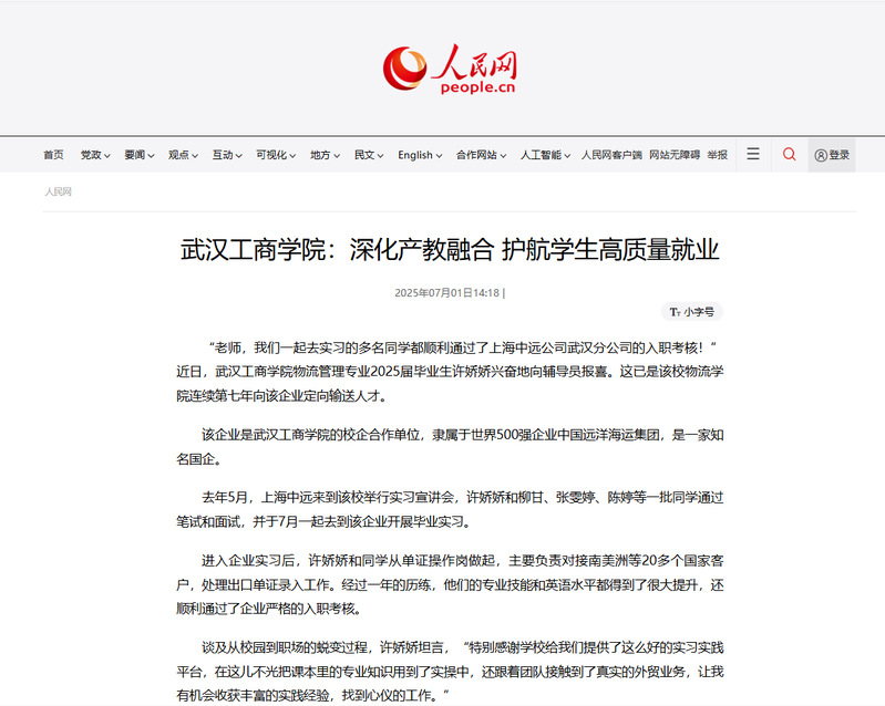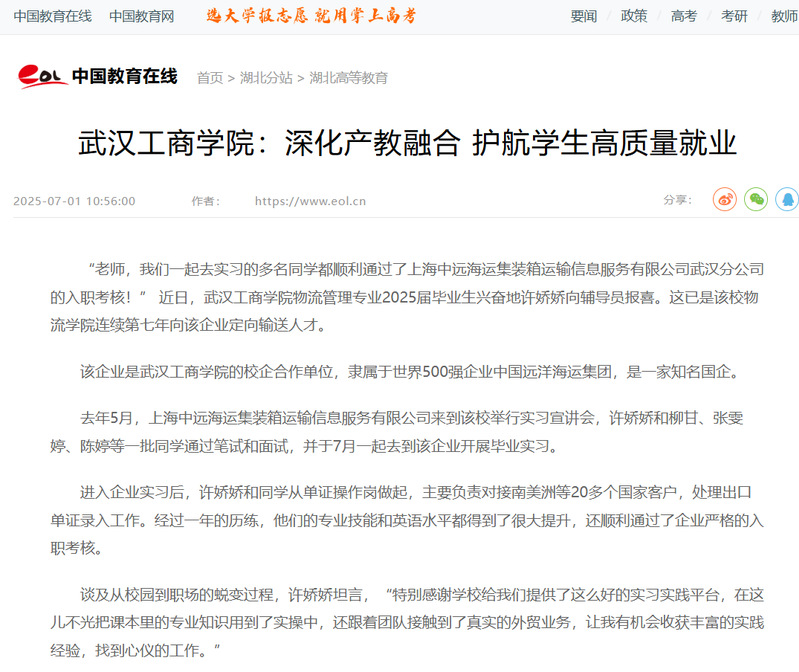 近日,bat365平台官网物流学院毕业生许娇娇等学生顺利通过了上海中远公司武汉分公司的入职考核,被人民网、中国教育在线、腾讯网报道,报道新闻如下: