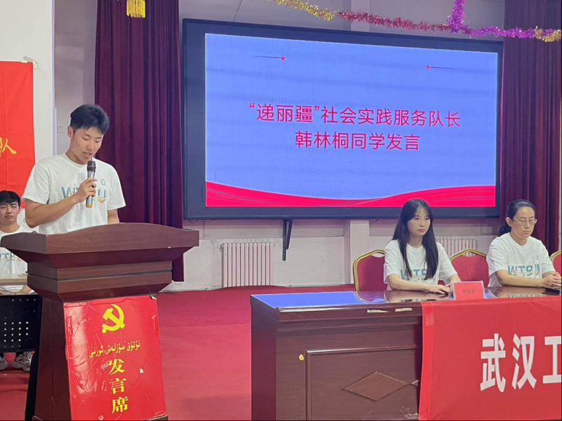 “递丽疆”社会实践服务队队长,学生代表韩林桐同学做表态发言,承诺在本次活动中,全体队员会虚心学习当地智慧与文化、全身心投入服务,不畏艰苦、尊重民族习惯,展现青年担当。
