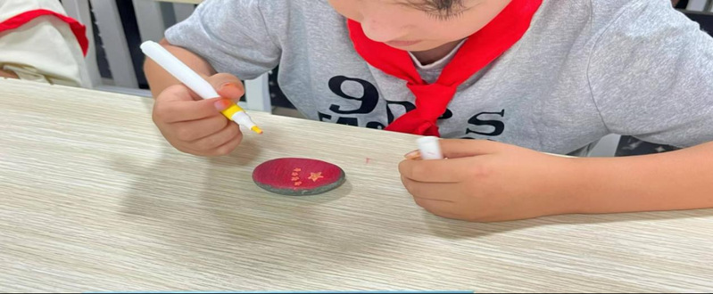每一块石头都成为了独一无二的艺术品。沙尼亚用简洁有力的线条勾勒出国旗的形状,五颗五角星鲜明醒目。她说:“我最喜欢中国红,它是国旗的颜色,最醒目、最热烈、最有活力。我们都是中华民族的一份子,看到国旗,我就觉得特别骄傲。” 当被问到长大的愿望时,她眼神坚定地回答:“我长大想当老师,把我知道的红色故事都讲给同学们听,让他们也像我一样热爱祖国!”