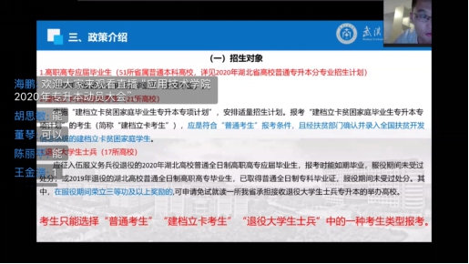 首先,由该学院党总支副书记海鹏对今年已发布的招生政策进行了讲解。他带领大家回顾了前期学生们备考情况,向学生们讲解了专升本的优势;重点对教育厅《省教育厅关于做好2020年普通专升本工作的通知》在专升本的招生对象、报名、考试、录取等内容上做了详细讲解,并以武汉工商招生计划为例介绍了今年的招生计划分配情况。在讲解过程中,他结合学生提出的关于专升本考试的疑问进行了解答。通过讲解,帮助学生了解今年专升本政策上的变化,让学生知晓了获取专升本信息的渠道,让学生对今年的专升本政策有了更详细的认识。