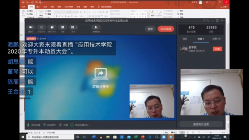 6月19日20:00,应用技术学院通过钉钉直播组织召开了“云端”专升本动员会。出席本次动员会的有该学院院长金学武,党总支副书记海鹏,毕业年级辅导员及意向专升本学生,动员会由该院党总支副书记海鹏主持。