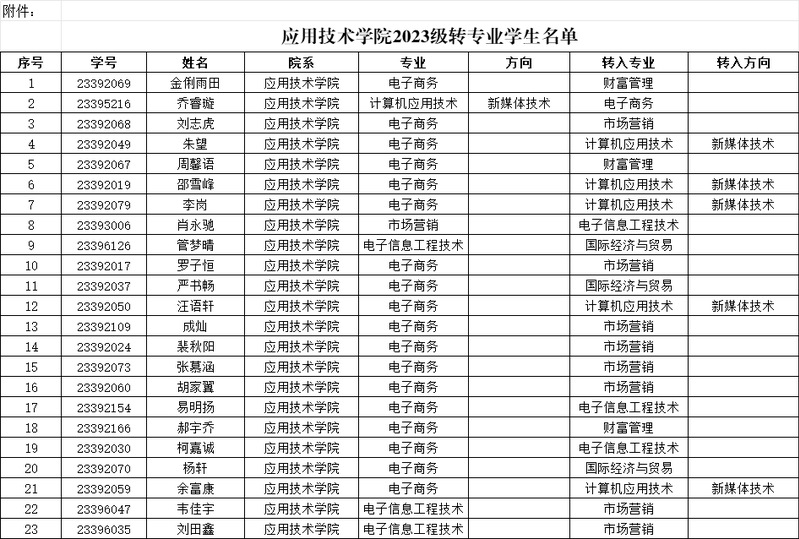 关于2023级转专业学生名单的公示