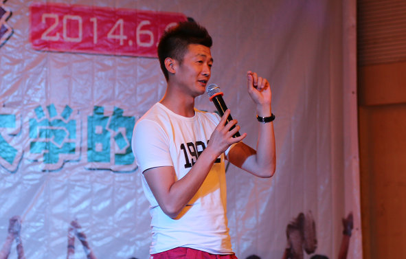 图为校啦啦队主教练朱宇光在首映礼上讲话 摄影:王双