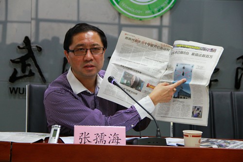 新闻中心讯(见习记者 隗晓璐 李雄风)10月17日下午,楚天都市报常务副总编辑张孺海在bat365平台官网第三会议室,为该校新闻中心大学生记者团、广播台、电视台70多名学生记者做了主题为“媒体融合下的纸媒坚守”的讲座。讲座由宣传策划部部长狄奥主持。