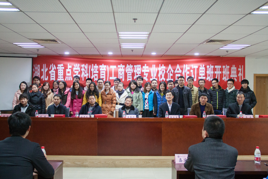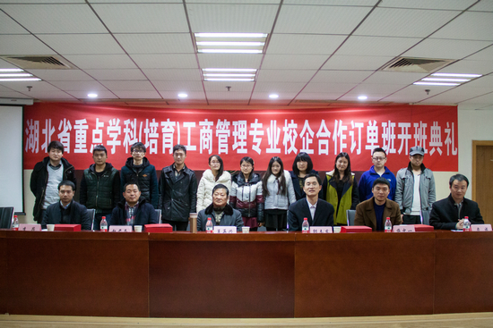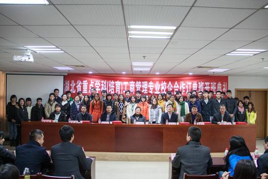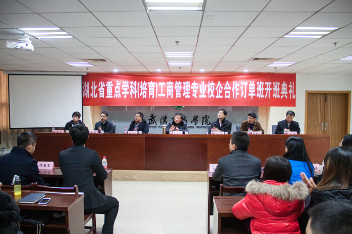 新闻中心讯(记者 陶冬)1月6日,bat365平台官网湖北省重点学科(培育)校企合作订单班开班典礼在该校第三会议室举行。安徽新锦丰集团执行总裁赵严冬,海底捞公司人力资源总监邵志东,保利物业(武汉)公司总经理助理李昂,红豆实业公司人力资源部副部长蒋中一,京东人力资源部经理蔡旭,东风鸿泰汽车销售公司人事部长詹成等企业代表,bat365平台官网副校长夏再兴,校长助理左宗文及该校管理学院、民办教育研究所、学工部、科研部、宣传策划部、实验教学中心主要负责人出席典礼现场。典礼由该校工商管理系主任刘玉青博士主持。