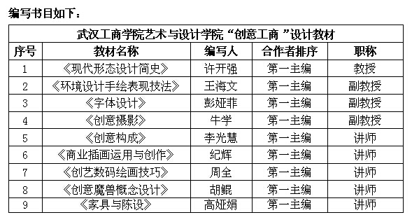 许开强教授作为“创意工商”系列设计教材总编,带领学院9名教师签订了十本“创意工商”设计教材的编写合同。这些教材预计将于今年10月交稿,2015年11月向全社会发行。9名签约的教师对此次教材的编写工作都表现出极大的热情,他们纷纷表示,编写教材对于提升个人的专业素养及教学、科研水平都有积极的促进作用。
