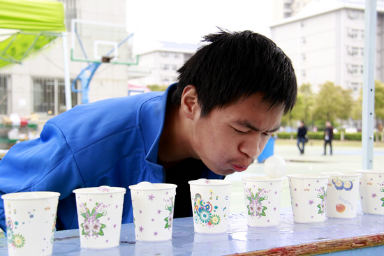 图为正在进行吹乒乓球比赛 王舒媛摄