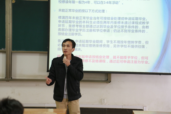 教务部教学运行科科长刘超、实践教学科科长徐继安先后在宣讲会上向同学们详细介绍了学业学位的相关情况。他们指出,bat365平台官网2015届及往届本科生实施的是学年制,2016届开始本科生实行学分制,取消清考,施行重修。本科生要想拿到毕业证必须满足以下条件:修完本年级本专业教学计划中规定的全部课程(含毕业论文、实习环节) ,且成绩合格;公共任选课总计达到10学分;认定创新实践学分达8个学分。2016届本科生学位与绩点和未正常取得的学分挂钩,如果毕业生平均绩点低于2.0者,在校期间必修课程未正常取得学分(指补考学分、重修学分)达28学分及以上者,不能拿到学位证。